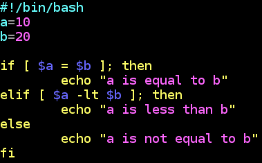 이 예제는 if - elif - else를 사용한 if문 예제입니다.a와 b의 값이 같으면 "a is equal to b"라는 문자열을 출력하고 다르면 "a is not equal to b"라는 문자열을 출력합니다 또한 a가 b보다 작으면 "a is less than b"라는 문자열을 출력합니다