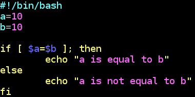 이 예제는 if - else를 사용한 if문 예제입니다. a와 b의 값이 같으면 "a is equal to b"라는 문자열을 출력하고 다르면 "a is not equal to b"라는 문자열을 출력합니다.